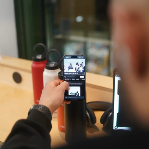 Die Hydrahold Flasche hält nicht nur dein Getränk perfekt temperiert – sie verwandelt sich auch in einen stabilen Halter für dein Tablet oder Handy.